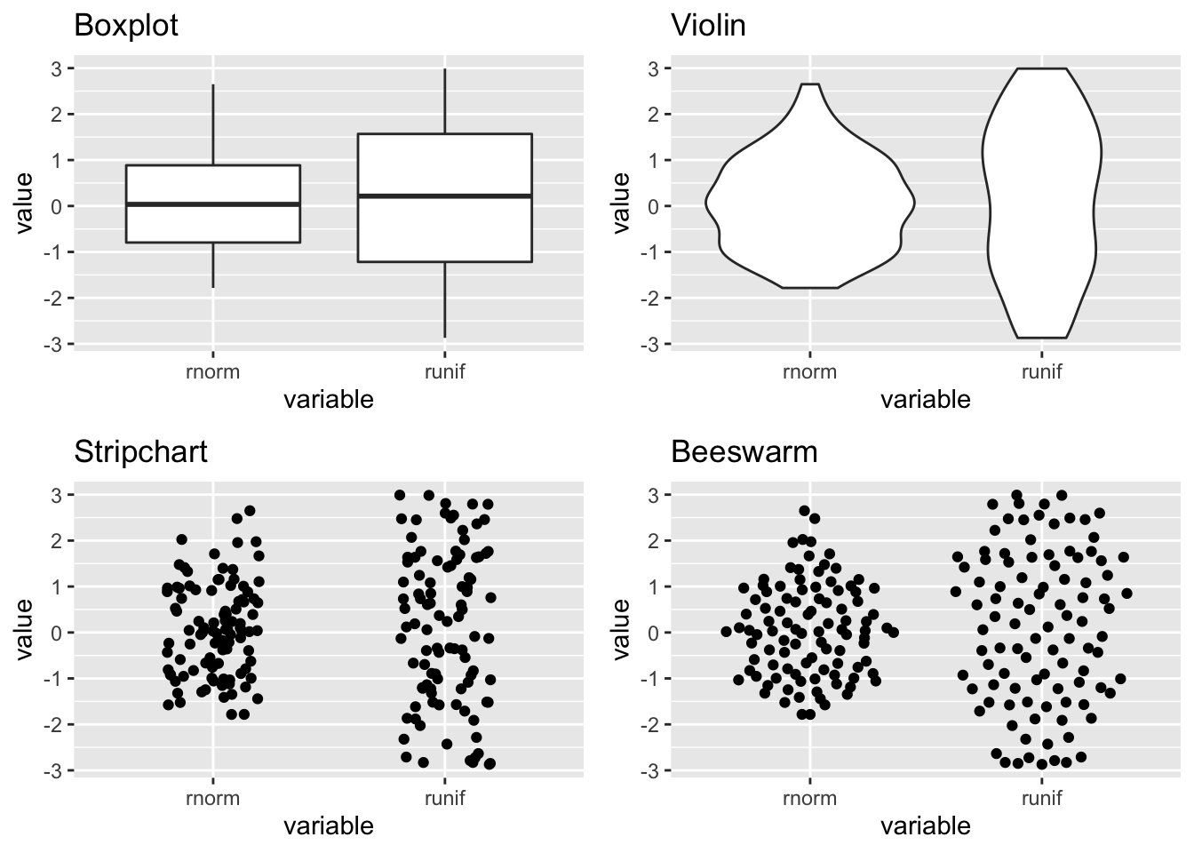 strip <- canvas + geom_jitter(width = 0.2) + ggtitle("Stripchart")