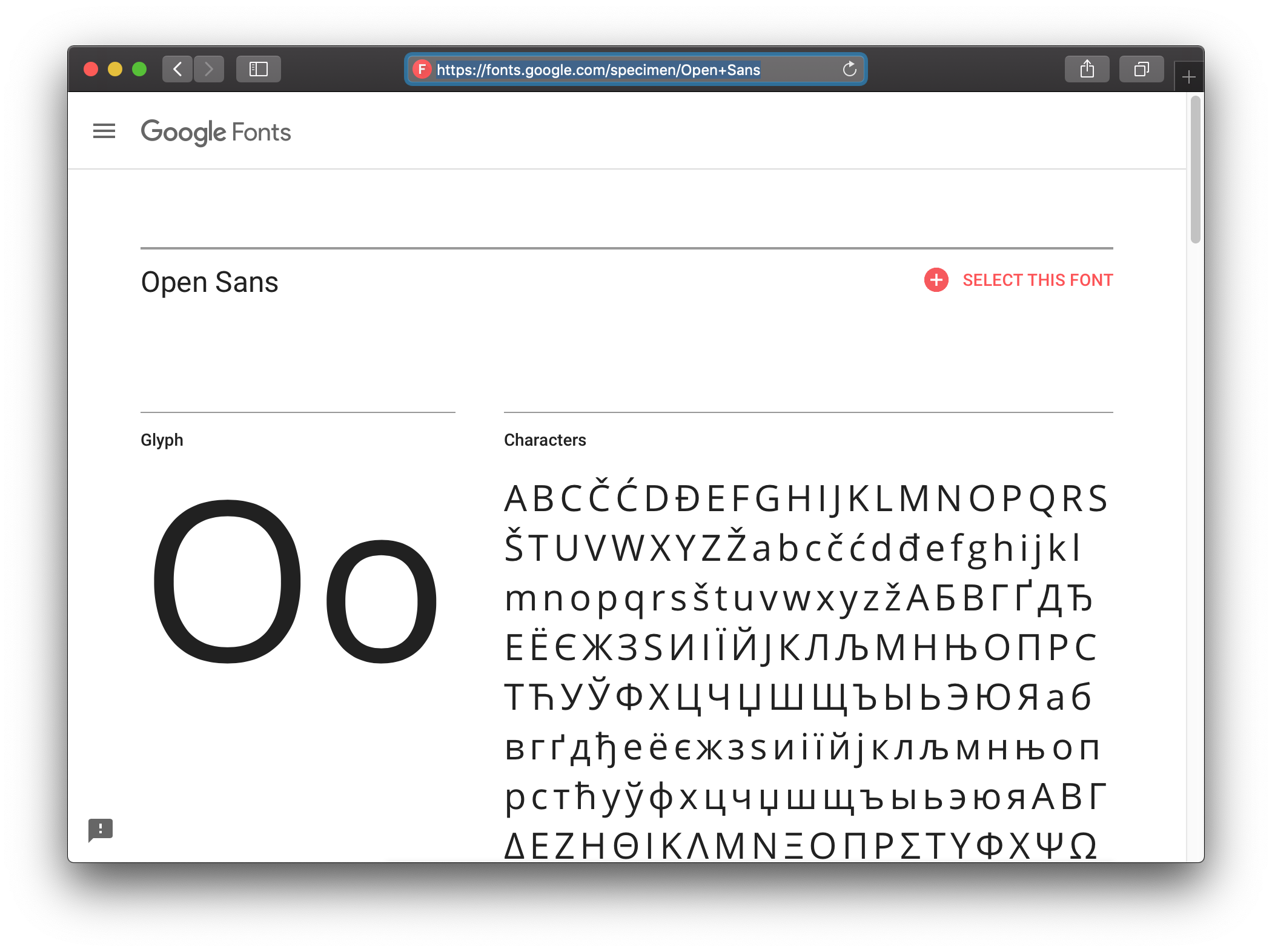 Click a font name to go to a specimen page (example: Open Sans). Here you can see who designed it and a bit of information about the font itself. Of course, you also get a preview of the characters and styles. There’s even some suggestions for popular pairings.