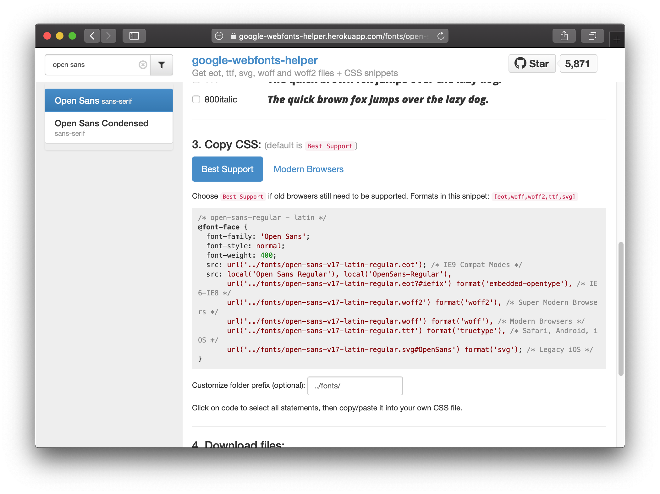 Rather than use Google Fonts to get the files, I recommend you use Google Web Fonts Helper). Why? It has a simple interface and gives you what you need in one screen (example: Open Sans).