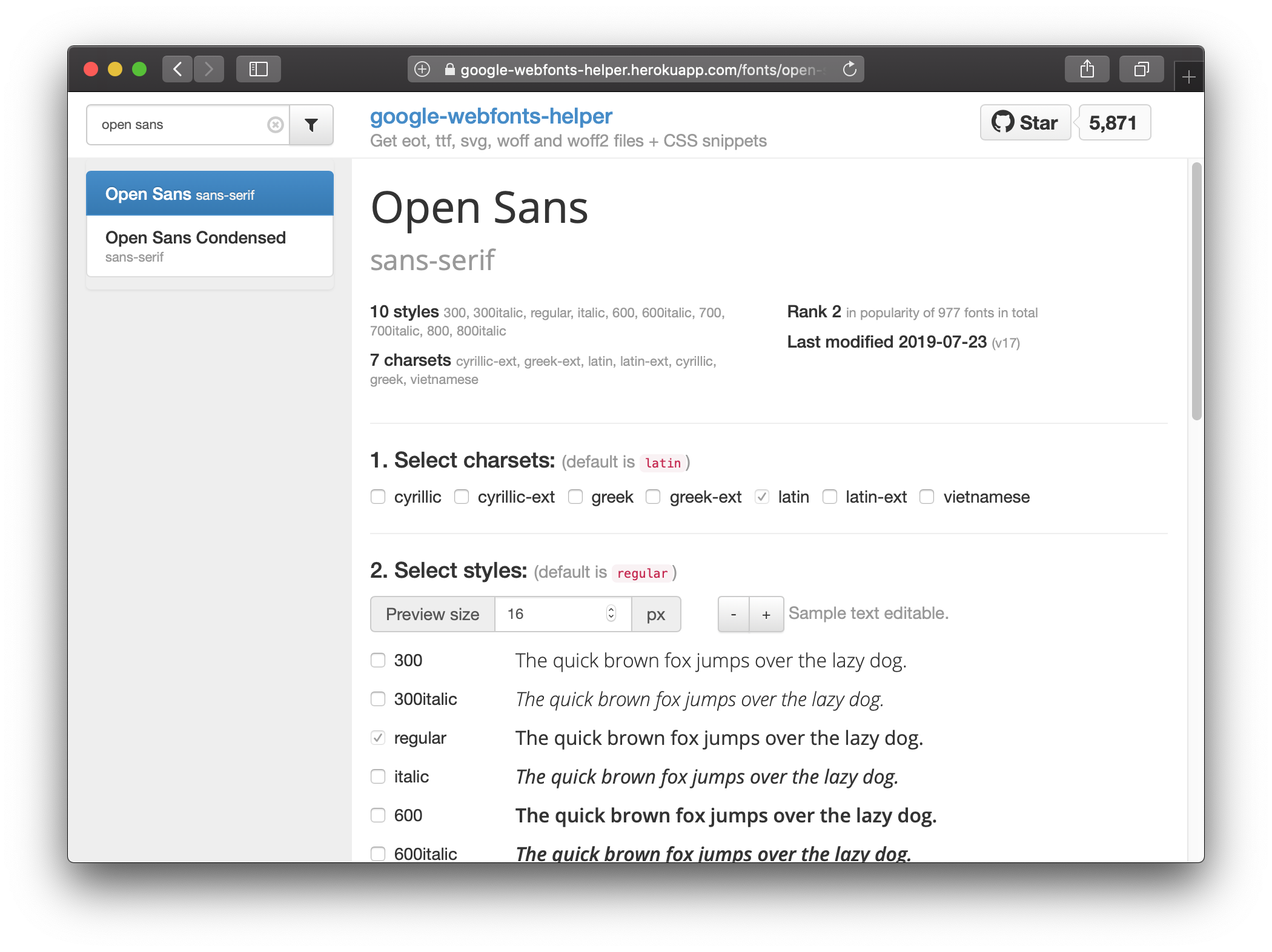 The Google Fonts catalog has nearly a thousand open-source fonts that you can use for your site. You can filter by categories (serif, sans-serif, monspace, etc), language and font properties (thickness, slant, etc) to find what you’re looking for. You can type a sentence and see how it looks in each font.