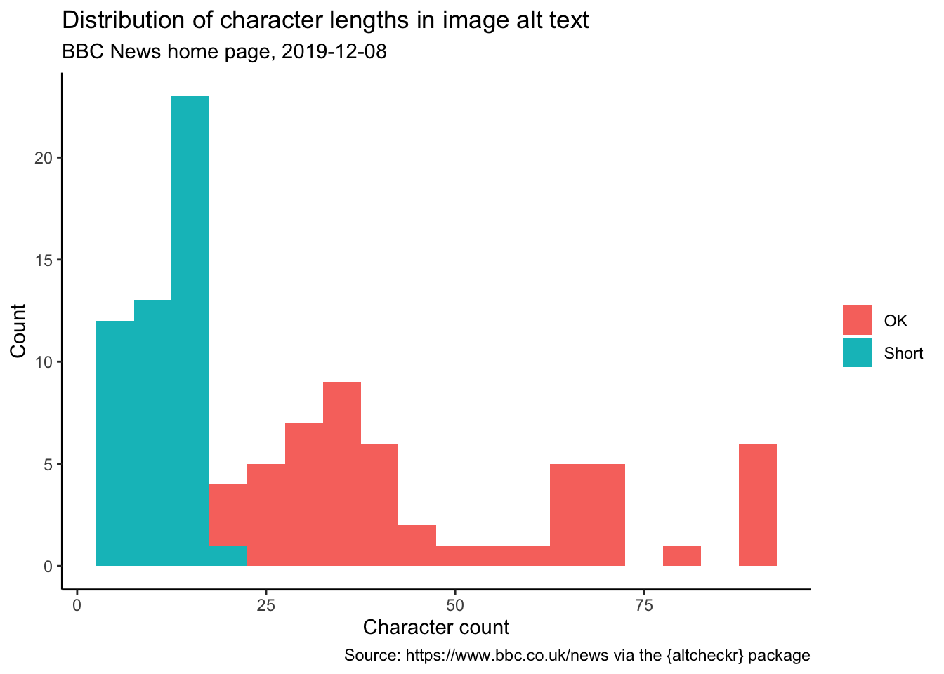 Note that {altcheckr} isn’t intended to provide a definitive evaluation of alt text. It uses simple heuristics and doesn’t contain everything that could be checked. I’m not an expert and the package isn’t user tested.