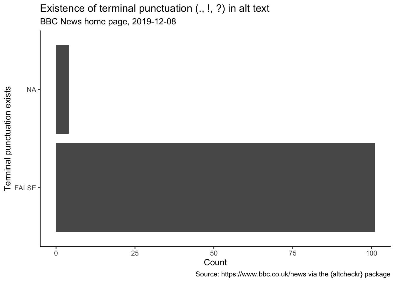 So most of the alt text does not end in terminal punctuation (FALSE), which is a bit disappointing. This means a screen reader might not fully parse the image as a complete sentence.