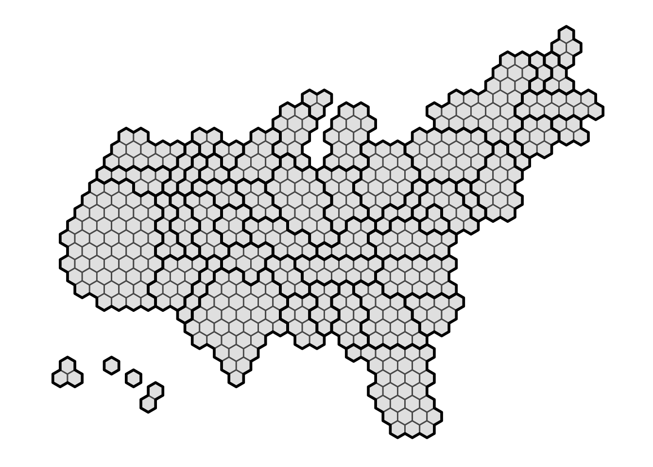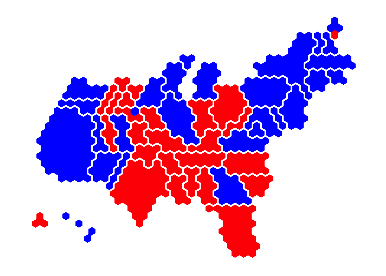 You can see that each elector is represented by a single hexagon and groups of hexagons are combined into states (thick outlines). Hexagons are placed roughly in the familiar shape of the US despite the change to the apparent area of each one. The non-contiguous regions in the lower left are Alaska (three electors) and Hawaii (four).