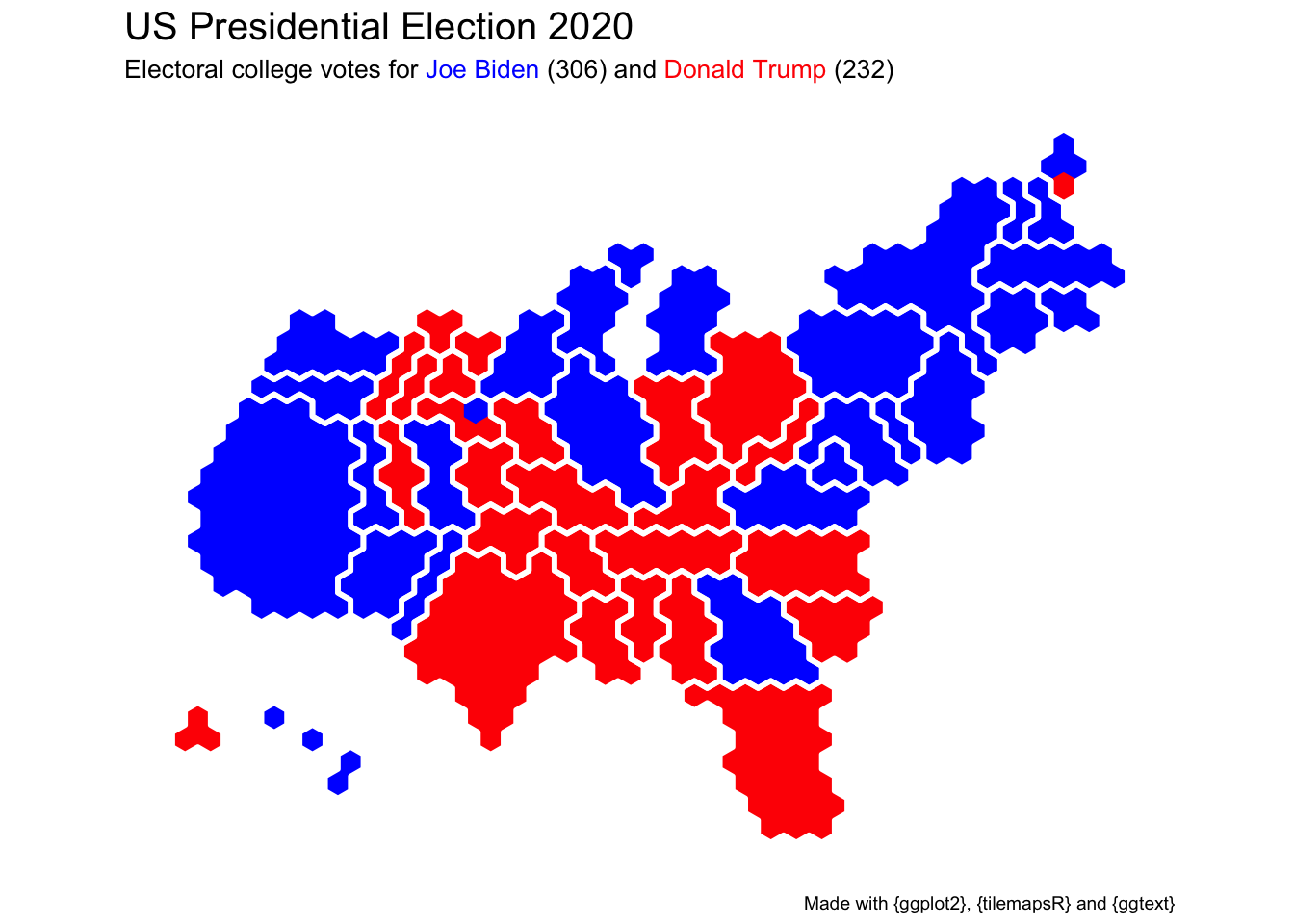 The {tilegramsR} package for R contains a geospatial object for mapping the US electoral college. I amended it for states that use the congressional district method and generated a minimalist map of the results for the 2020 US presidential election.1