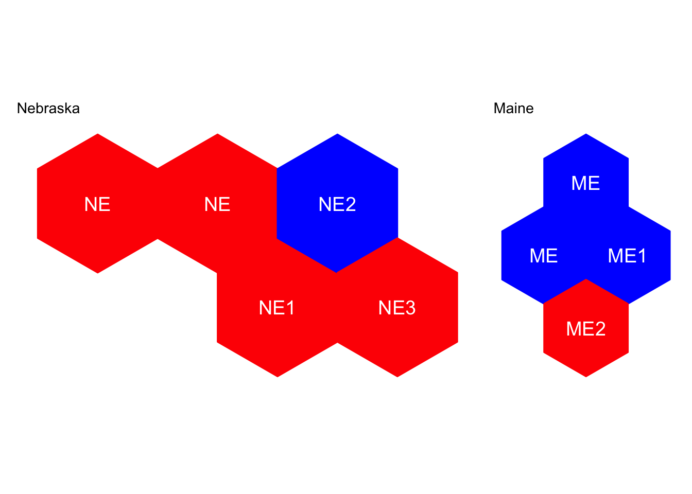 This is sometimes represented in electoral college maps by colouring Nebraska and Maine with stripes of with each party’s colour. We can avoid that suboptimal representation with a tilegram because we can individually colour our tiles.