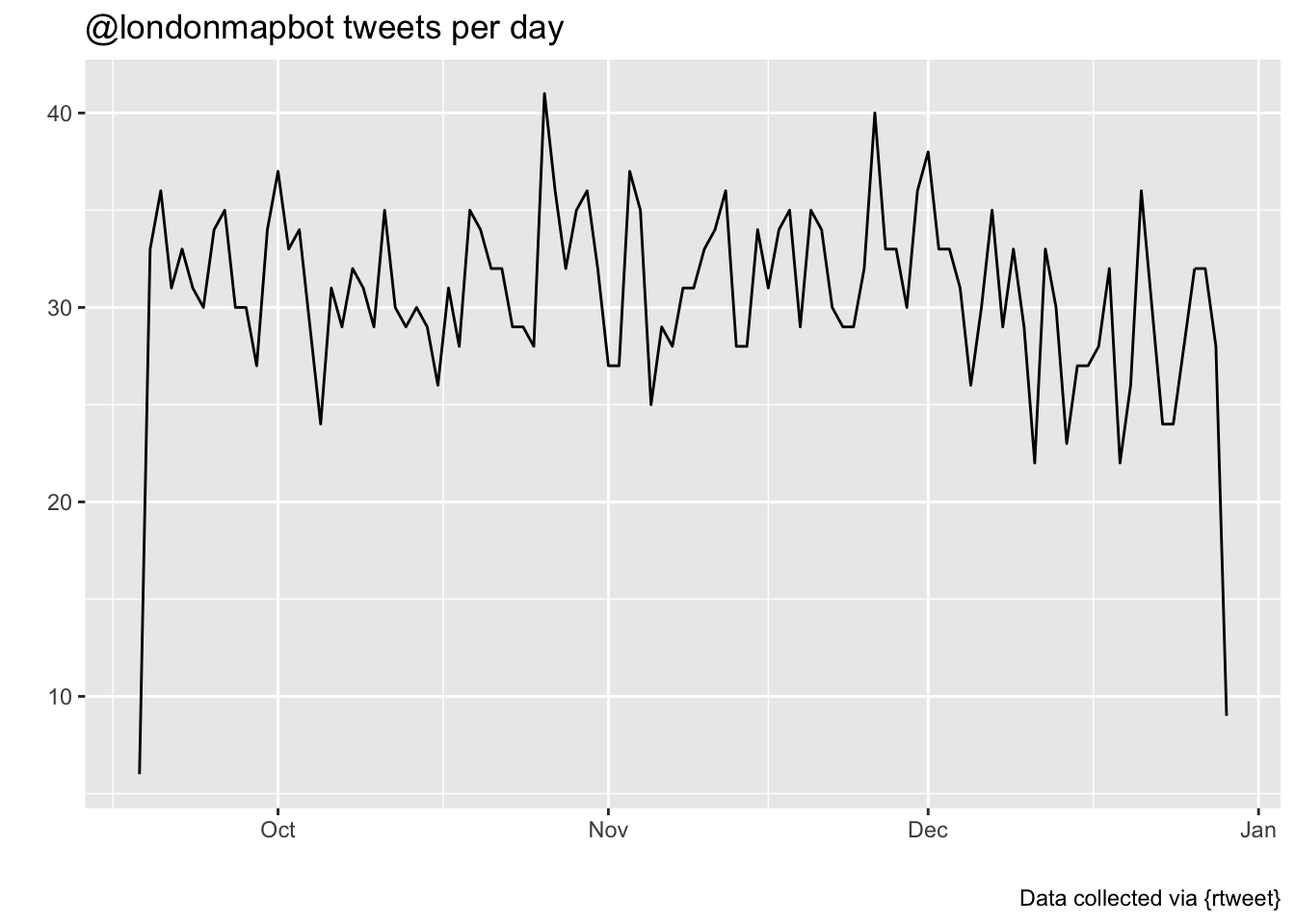 {rtweet} has a function to quick-plot tweets over time. There’s meant to be a tweet every half-hour from londonmapbot, but GitHub Actions has been a little inconsistent and sometimes fails to post.