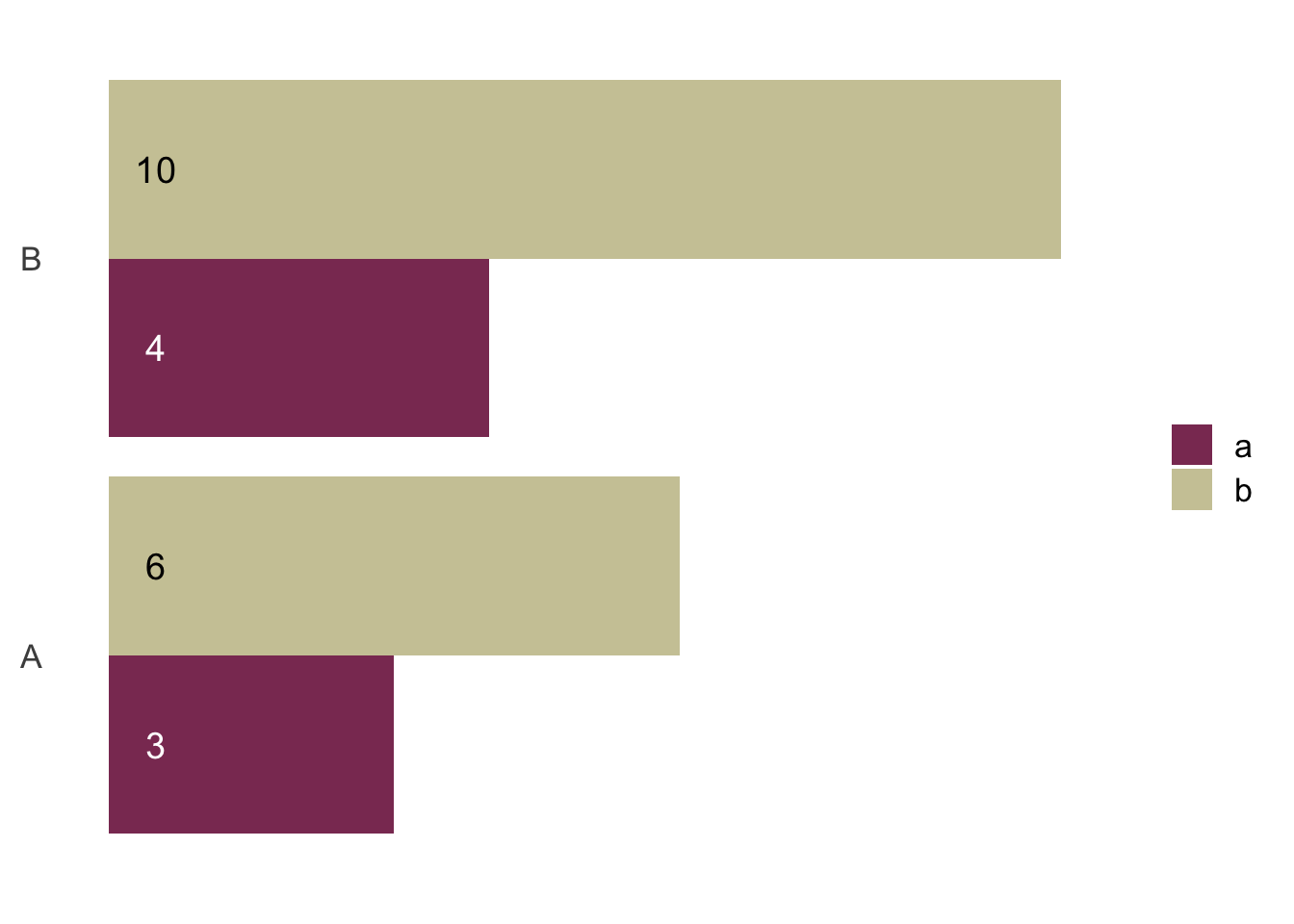 To demonstrate better, let’s create a grouped barplot with lighter (lemonchiffon3) and darker (hotpink4) fill colours, then use cr_choose_bw() to choose black or white for the overlaying text.