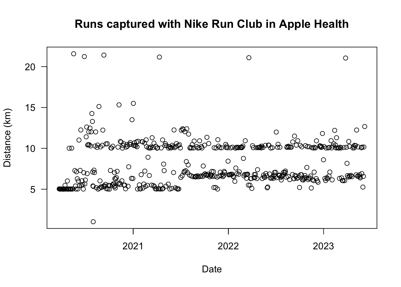 You can use R to extract running details from a downloaded of your Apple Health data. My old code broke, so I re-wrote it.